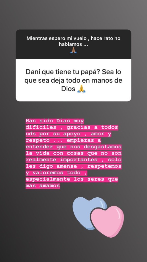 Daniela, en su Instagram, como lo hace cotidianamente, estuvo respondiendo preguntas de sus seguidores y uno de ellos le preguntó por la salud de su padre.