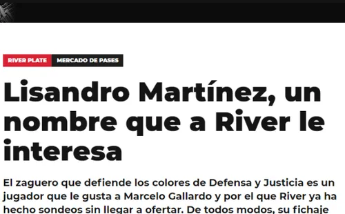 Fruto del interés del Rennes de Francia en hacerse con los servicios del defensor Lucas Martínez Quarta, River ya habría comenzado a tantear la situación de Lisandro Martínez, deportista de Defensa y Justicia.