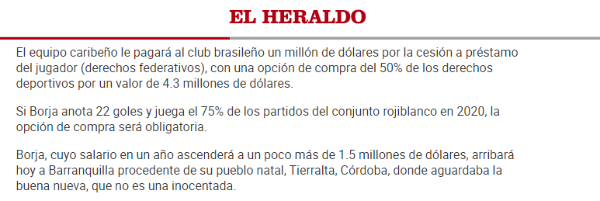 Según el diaro El Heraldo, Junior le pagará a Borja cerca de 1.5 millones de dólares por el próximo año. Eso quiere decir que, mensualmente, el delantero percibirá 125 mil dólares, lo que equivale a 450 millones de pesos colombianos.