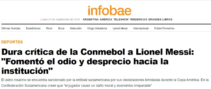 Haciendo referencia a la expansión y notoriedad global que tuvieron los dichos de Messi, el fallo insistió: “La noticia tuvo un alcance de audiencia negativa en Sudamérica de 137 millones de personas, con aproximadamente 400 publicaciones negativas en medios, todo ello sin contar el impacto negativo con los propios patrocinadores de la organización”.