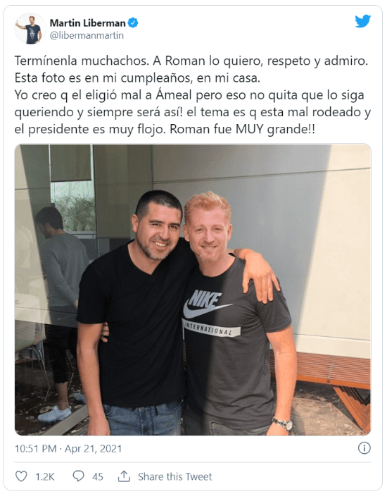 “Termínenla muchachos. A Roman lo quiero, respeto y admiro. Esta foto es en mi cumpleaños, en mi casa. Yo creo queel eligió mal a Ameal pero eso no quita que lo siga queriendo y siempre será así! El tema es q esta mal rodeado y el presidente es muy flojo. Roman fue MUY grande!!”, explicó Liberman, que acompañó el texto con una imagen suya con el máximo ídolo de Brandsen 807.