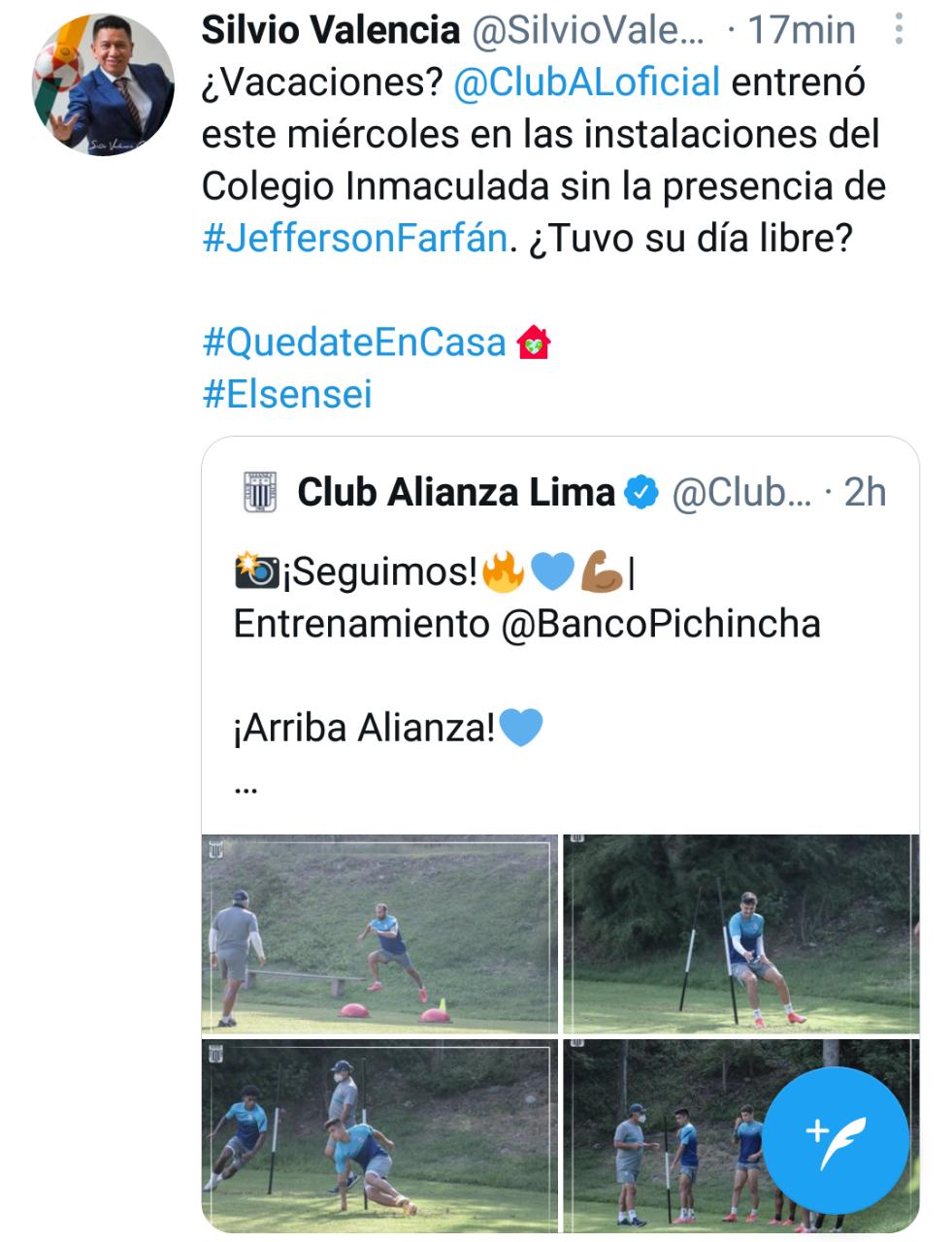 “¿Vacaciones? Alianza Lima entrenó este miércoles en las instalaciones del Colegio Inmaculada sin la presencia de Jefferson Farfán. ¿Tuvo su día libre?”, escribió sus redes junto a las imágenes del club.