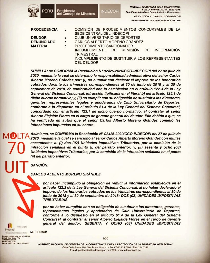 “70 UIT, es decir, 308 mil soles tendrá que pagar como sanción económica impuesta por Indecopi, el inefable exadministrador de Universitario Carlos Moreno, x sus graves incumplimientos durante su gestión”, escribió por ejemplo Pierre Manrique al respecto.