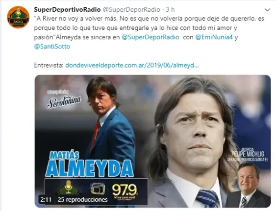 Con respecto a la relación que aún hoy en día mantiene con River, Almeyda deslizó: “Desde que terminó todo lo del ascenso no entré nunca más a la cancha. En realidad, fui a saludar una vez a los utileros que tengo una gran relación con ellos”.