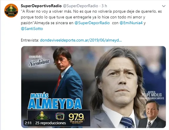 Recordando aquel momento y hablando de su ciclo en la institución de Núñez, el ex deportista habló con Super Deportivo Radio y explicó: “Mi etapa en River ya pasó, lo que tuve que vivir, lo viví como jugador y como entrenador me tocó el año más feo de la historia y lo pudimos ganar”. “Hay que saber decir basta.No es que no volvería porque dejé de quererlo, es porque lo que viví ya lo viví y lo que tuve que entregar lo hice con todo mi amor y pasión”, agregó.
