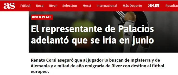 Según detalló AS,Renato Corsiexplicó que el mediocampista cuenta con muchas chances de emigrar y dejar el fútbol argentino a mitad de año.