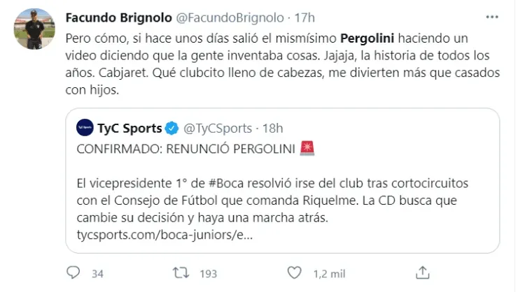 “Hola, ¿qué tal? Un saludo para la gente de Boca. Sí, estoy acá para confirmar que presenté la renuncia indenicable a la vicepresidencia primera del club”, comenzó diciendo Mario Pergolini en una publicación de Instagram que al poco tiempo tenía miles y miles de reproducciones, habiendo sido levantada por todos los medios de comunicación.