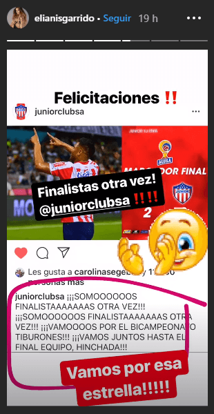 La actriz barranquillera dejó ver toda su felicidad en Instagram luego de que Junior derrotara a Nacional en Medellín y se metiera en una nueva final del FPC.