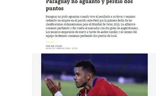 La web ABC escribió: “La Albirroja comenzó perdiendo y dio vuelta el marcador con dos goles de Ángel Romero. Los incaicos empataron a través de André Carrillo y el camino del equipo de Berizzo comienza perdiendo dos puntos de local”.