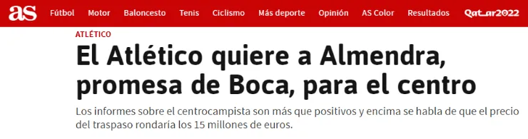 Detallando que “los informes sobre Almendra son más que positivos”, el portal en cuestión agregó que el precio del traspaso de Agustín rondaría en torno a los 15 millones de euros, una suma relativamente baja para lo que está acostumbrado a pagarse en el mercado de pases europeo.
