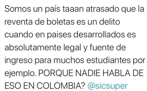 “Somos un país tan atrasado que la reventa de boletas es un delito cuando en paises desarrollados es absolutamente legal y fuente de ingreso para muchos estudiantes por ejemplo”, aseguró Ramón Jesurún, el hijo de su padre también llamado Ramón Jesurún, en su cuenta de Twitter.