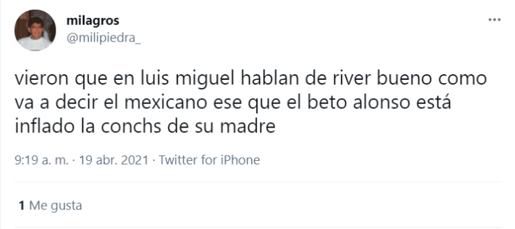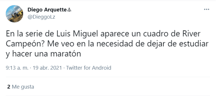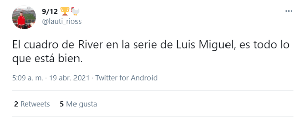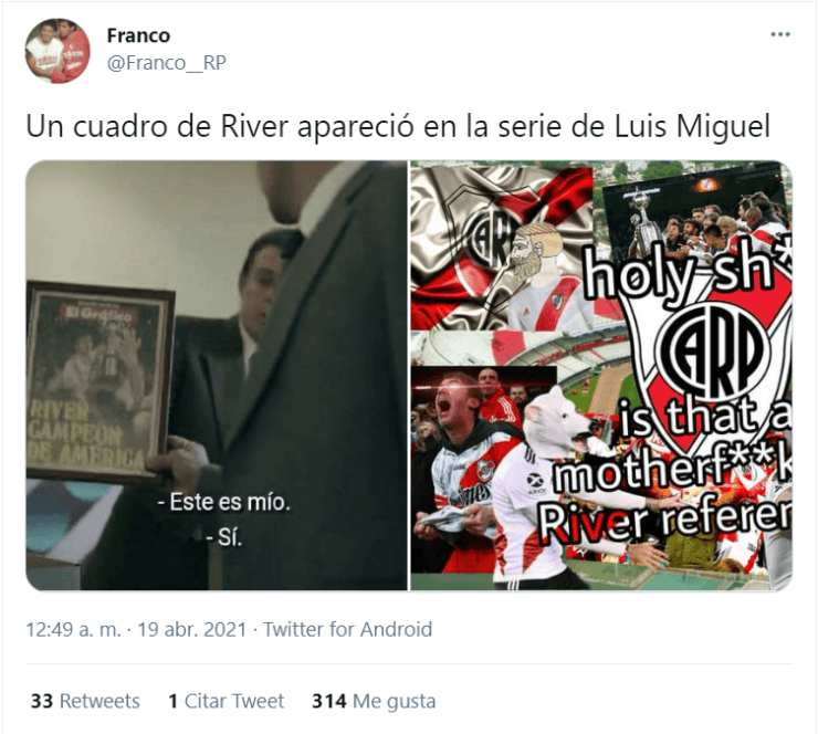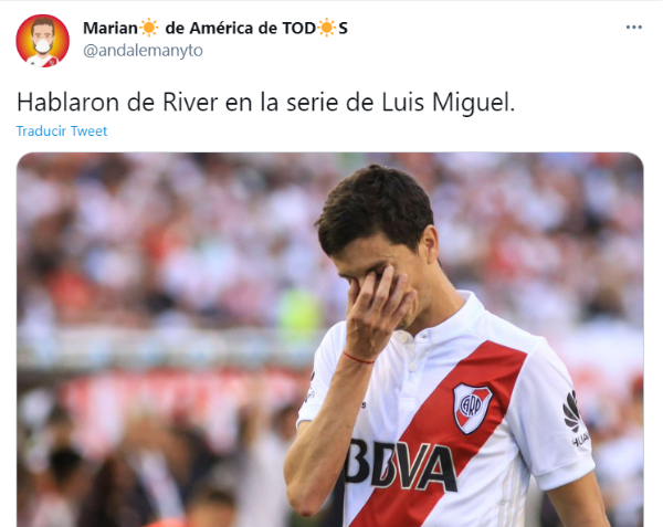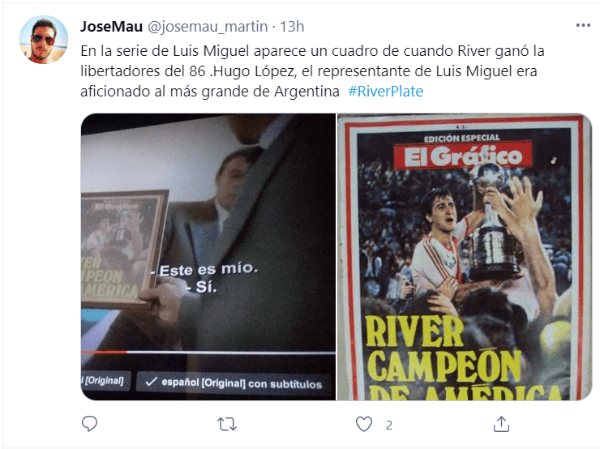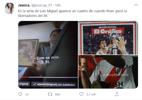Y claro, volvió a ser protagonista la imagen del ‘Beto’ con el trofeo más preciado del continente en manos, con la inscripción “River campeón de América”.“Hugo López, representante de Luis Miguel, me llevó a México para jugar un fútbol rápido y por eso aparece mi foto en la serie”, había contado el histórico jugador tiempo atrás.