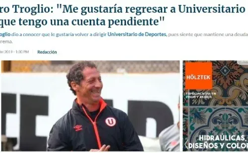 Troglio reconoce que el momento de la U no es bueno pero admitió que futbolisticamente el equipo actualmente se encuentra mejor conformado al que dirigió. “Hoy veo a la U como club mucha más tranquilidad, con contrataciones. Siempre veo la posibilidad de volver a Perú. Me gustaría, algún día. Tengo una cuenta pendiente.Sería difícil de hacerle un desplante de ir al equipo contrario. Por el trato de la gente. Sería difícil dirigir a Alianza, sí podría dirigir a cualquier otro equipo de Perú”, confesó.