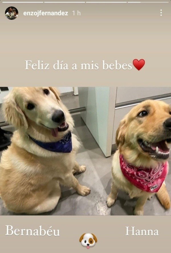 Enzo Fernández subió una foto de sus dos perros y escribió: “Feliz día a mis bebés”. Hasta todo muy normal. No obstante, el detalle es cómo se llama uno de los perros: “Bernabéu”. Sí, más gallina que Enzo Pérez.