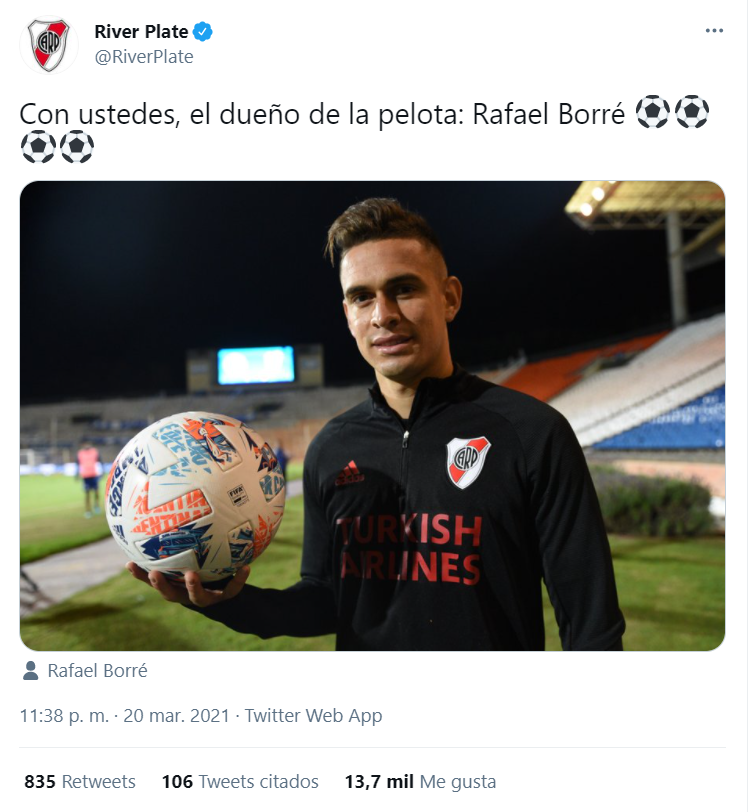 Profundizando sobre dicha cuestión, siguió: “Hoy no hay nada definido de lo que va a pasar con Borré. Cuando los jugadores vienen de afuera, hay mucho de los jugadores. Sabemos que estamos muy lejos económicamente de Europa, Estados Unidos y México.Es siempre un esfuerzo que tiene que hacer el jugador con el tema del dólar en Argentina.Rafa siempre ha estado muy feliz de estar en Argentina, de vestir esta camiseta,de tener el crecimiento que ha tenido como jugador. Y eso es un poco lo que lo ha sostenido. Yo creo que cualquier otro jugador, en ese sentido hubiera hecho lo mismo que Rafael.Porque ha encontrado un club que lo contiene y que le ha mostrado al mundo quién es Rafael Borré”.