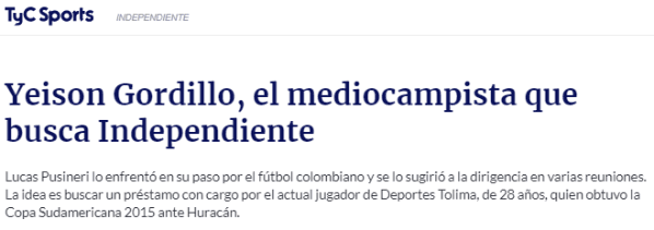 Según publica Tyc Sports, desde Independiente de Avellaneda estarían muy interesados en los servicios de Yeison Gordillo, quien actualmente defiende los colores del conjunto Deportes Tolima. El nombre fue propuesto por Lucas Pusineri, quien ya lo enfrentó cuando fue director técnico del Deportivo Cali.