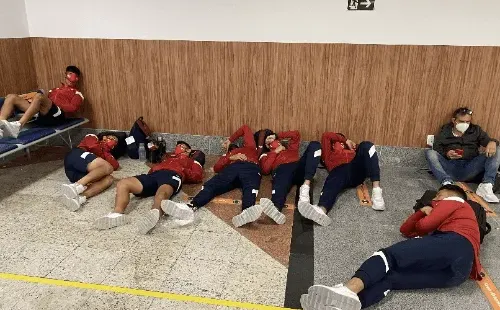 Los futbolistas del rojo que dieron negativo en el test ya pudieron trasladarse para descansar en el hotel, mientras que el resto debió quedarse en el aeropuerto durmiendo sobre colchonetas. Un escándalo.