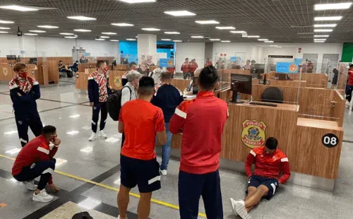 El plantel llegó a territorio extranjero y, como en cada viaje, debieron hisoparse antes de viajar hacia el hotel. Varios jugadores que ya se habían recuperado de coronavirus dieron positivo y no fueron autorizados para abandonar el aeropuerto. Pese a estar habilitados por CONMEBOL, el trámite tardó en resolverse y toda la delegación nunca pudo moverse de donde estaba, teniendo que dormir en el piso.