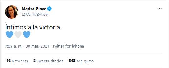 Algunos políticos también se han manifesto. Este es el caso de Marisa Glave, quien escribió en twitter el siguiente mensaje: “Íntimos a la victoria…”.
