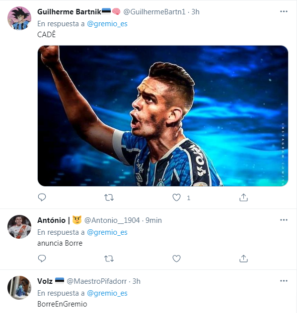 Desde los últimos días, cada tuit de Gremio, sea del tema que sea, hay comentarios de los fanáticos mencionando a Borré y, lógicamente, lo hicieron tendencia al que hoy por hoy es jugador de River. Por ahora, todo parece indicar que Gallardo lo tendrá en cuenta hasta mitad de año.