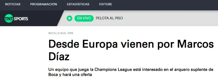 Según detalló TNT Sports, desde Europa, pese a los pocos minutos del portero en el último tiempo,estarían preparando una oferta más que suculenta por el guardameta.
