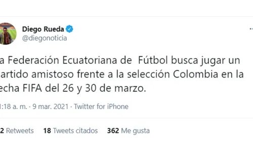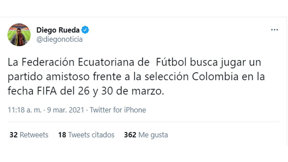 Según informó el periodista, Diego Rueda, la Federación Colombia de Fútbol y la Federación Ecuatoria de Fútbol estarían en conversaciones para organizar un duelo amistoso entre ambas selecciones en la fecha FIFA en la que se jugaría las fechas 5 y 6 de la Eliminatoria Conmebol.