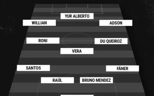 Cássio; Fagner, Bruno Méndez, Raúl,Fábio Santos; Du Queiroz, Vera,Roni; Adson, Willian y Yuri Alberto.