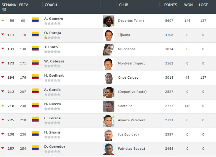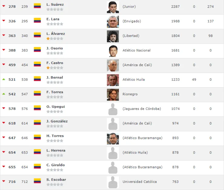Para destacar: Jorge Luis Pinto (Millonarios) quedó 131° y Juan Carlos Osorio (Atlético Nacional) 383°.