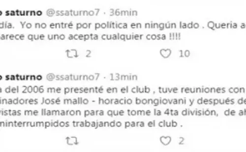 A lo que Saturno replicó: “Yo no entré por política a ningún lado. Quería aclararlo porque sino parece que uno acepta cualquier cosa. Un día de 2006 me presenté en el club, tuve reuniones con los coordinadores José Mallo y Horacio Bongiovani y después de varias entrevistas me llamaron para que tome la Cuarta División. De ahí en más, 14 años ininterrumpidos trabajando para el club”.