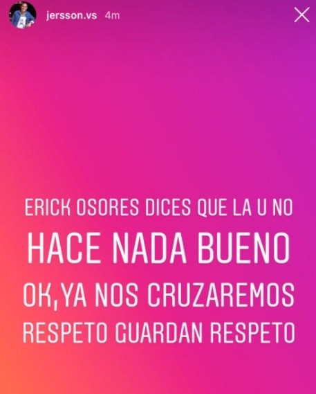 “Erick Osores dice que la U no hace nada bueno. OK, ya nos cruzaremos. Respetos guardan respetos”, le tiró el futbolista en su red personal.