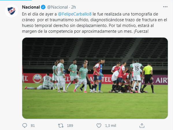 “En el día de ayer a Felipe Carballo le fue realizada una tomografía de cráneo por el traumatismo sufrido, diagnosticándose trazo de fractura en el hueso temporal derecho sin desplazamiento. Por tal motivo, estará al margen de la competencia por aproximadamente un mes. ¡Fuerza!“, comunicó el club.