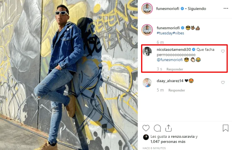 Así fue la útlima publicación de Funes Mori, quien despertó los comentarios de sus conocidos, entre ellos, los deNicolás Otamendi.