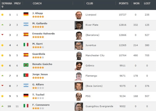 Allí, elige al mejor entrenador del mundo semana a semana, y en esta ocasión el de River quedó como el segundo, detrás de Klopp, líder del Liverpool.