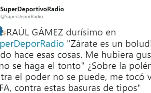 El directivo, sin siquiera dudarlo, se tomó de muy mala manera la actitud del deportista y lanzó: “Zárate es un boludito cuando hace esas cosas. Me hubiera gustado que no se haga el tonto”.