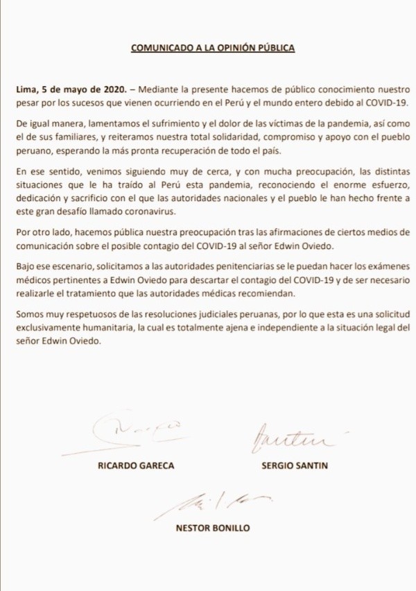 Este martes, entonces, quienes fueron contratados por Oviedo en la Selección Peruana se manifestaron. Ricardo Gareca, Sergio Santín y Nestor Bonillo, el comando técnico, emitieron un comunicado.