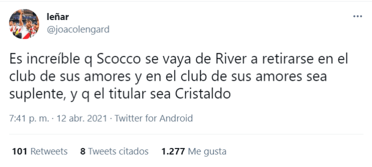 Varios hinchas del conjunto rosarino se enojaron y otros bancaron la decisión del flamante técnico, pero quienes tuvieron una postura unánime fueron los de River. Los fanáticos se volvieron locos en Twitter haciendo tendencia al delantero, preguntándose por qué se fue poco después de que comience la pandemia en 2020, ya que su objetivo era buscar más minutos y retirarse en el club de sus amores jugando, algo que parece no sucederá por un tiempo.