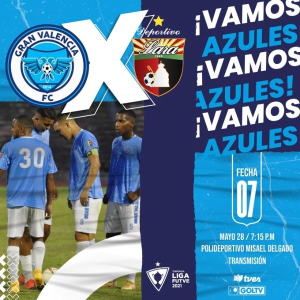 Por una nueva jornada delLiga Futve,Gran Valenciarecibe en su territorio al conjunto delDeportivo Laraen un choque que se realizará este viernes 28 de mayo. Las emociones de este cotejo se viviránEN VIVO Y EN DIRECTOa través de la pantalla deTVES yGolTV Play.