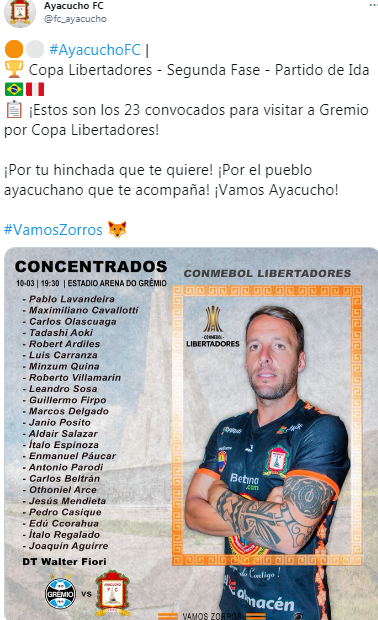 Por la Fase 2 de laCopa Libertadores de América,Gremio se enfrenta contraAyacuchoen un cotejo que se disputará este miércoles 10 de marzo. El cotejo será televisadoEN VIVO Y EN DIRECTOa través de la pantalla deFOX SPORTS 2,SBT y CONMEBOL TV.