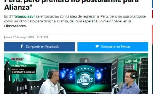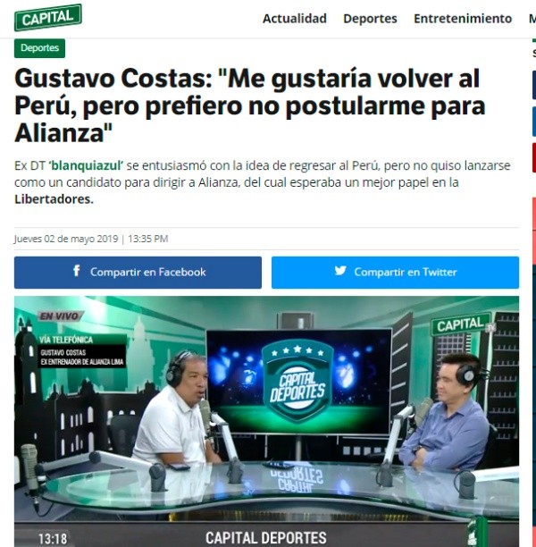 “Yo siempre estoy dispuesto.Alianza Limaes como mi casa. Si llega el momento, hablaré con la gente, pero hoy no quiero postularme porque no soy de esos.Si tengo que volver a dirigir en Perú, voy contentísimo”, le confirmó a Capital Deportes.