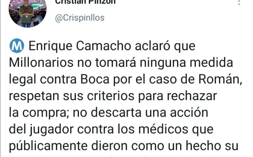 En la asamblea de dirigentes y accionistas de Azul y Blanco S.A, el Presidente de Millonarios Enrique Camacho se refirió acerca de una posible denuncia por parte de Millonarios hacia Boca Juniors por el tratamiento del caso de Andrés Felipe Román.