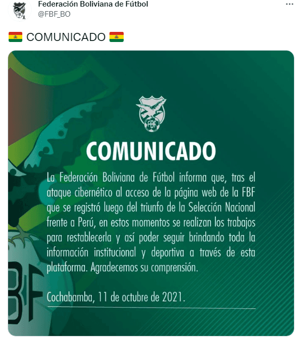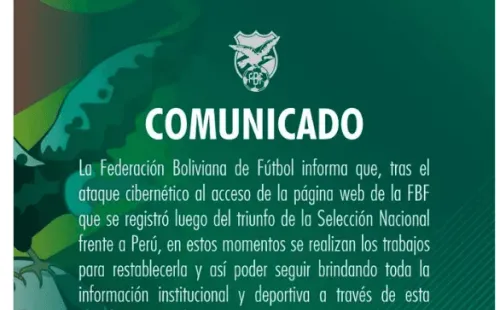 La FBF lanzó un comunicado antes de tomar el control nuevamente de su página: “La Federación Boliviana de Fútbol informa que, tras el ataque cibernético al acceso de la página web de la FBF que se registró luego del triunfo de la Selección Nacional frente a Perú, en estos momentos se realizan los trabajos para restablecerla y así poder seguir brindando toda la información institucional y deportiva a través de esta plataforma. Agradecemos su comprensión“.