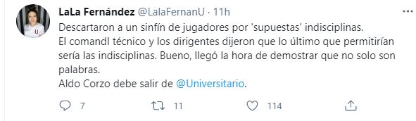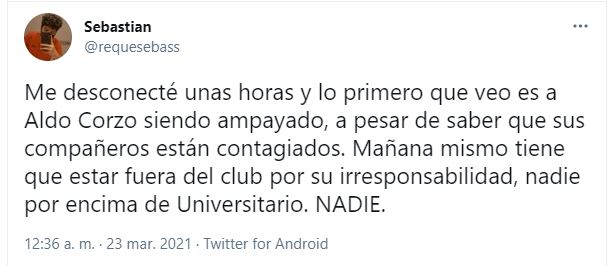 El pedido de los hinchas no solo es por la indisciplina, sino también por comprometer la salud de sus demás compañeros, ya que Aldo Corzo rompió con los protocolos sanitarios.
