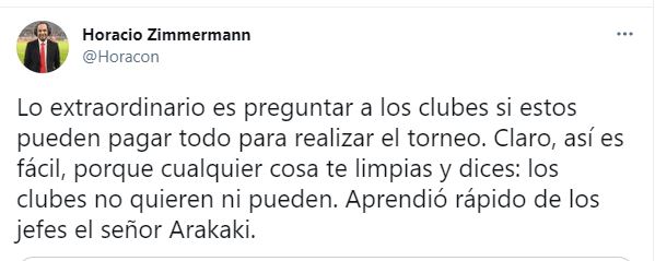 La respuesta de Horacio llegó mediante las redes sociales, donde cuestiona cómo se hará este torneo: “Lo extraordinario es preguntar a los clubes si estos pueden pagar todo para realizar el torneo. Claro, así es fácil, porque cualquier cosa te limpias y dices: los clubes no quieren ni pueden. Aprendió rápido de los jefes el señor Arakaki”.