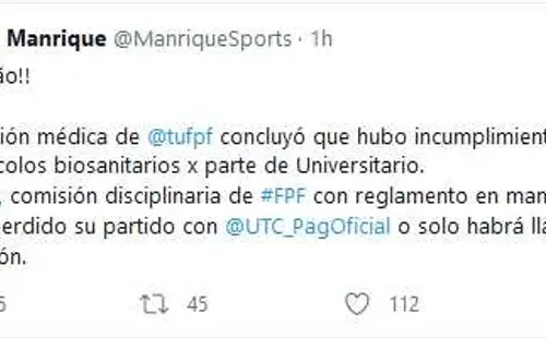“Comisión médica de FPF concluyó que hubo incumplimiento de protocolos biosanitarios por parte de Universitario. Ahora, comisión disciplinaria de FPF con reglamento en mano, evaluará si le da por perdido su partido con UTC o solo habrá llamado de atención”, señaló.