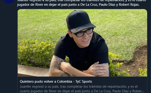 Con el permiso de River Plate y cumpliendo todo el proceso de repatriación, Juan Fernando Quintero decidió abandonar su domicilio en Buenos Aires, Argentina, para tomar un vuelo privado que lo llevó de vuelta a su tierra natal, Medellín, Colombia.