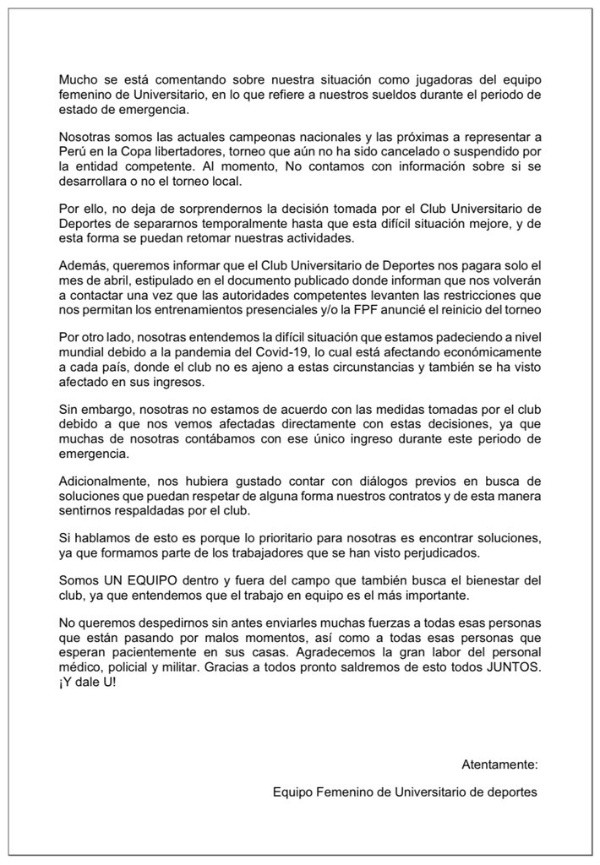 Automáticamente, el equipo de fútbol femenino se manifestó. Contaron que las habían desvinculado y que muchas no tendrían como generar ingresos.