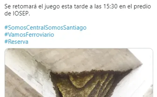El Ferroviario, por su parte y mediante su cuenta de Twitter, confirmó que logró dar con el origen del problema y reveló que elpanal de avispas que forzó la suspensión del partido fue divisadodebajo de una de las tribunas del predio.