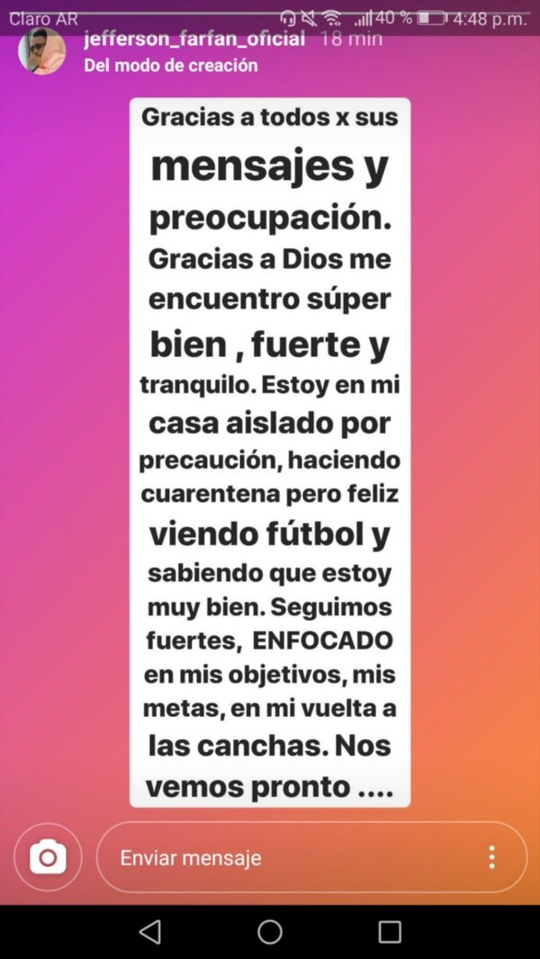 “Seguimos fuertes, enfocado en mis objetivos, mis metas, en mi vuelta a las canchas. Nos vemos pronto”, terminó el Diez de la Calle. Desde acá, le mandamos los mejores deseos ¡Fuerza Farfán!