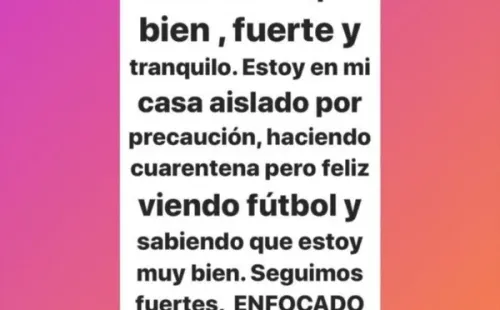 La Foca, tras saberse esto,se manifestó por Instagram: “Gracias a todos por sus mensajes y preocupación. Gracias a Dios me encuentro súper bien, fuerte y tranquilo. Estoy en mi casa aislando por precaución, haciendo cuarentena pero feliz viendo fútbol y sabiendo que estoy muy bien”.