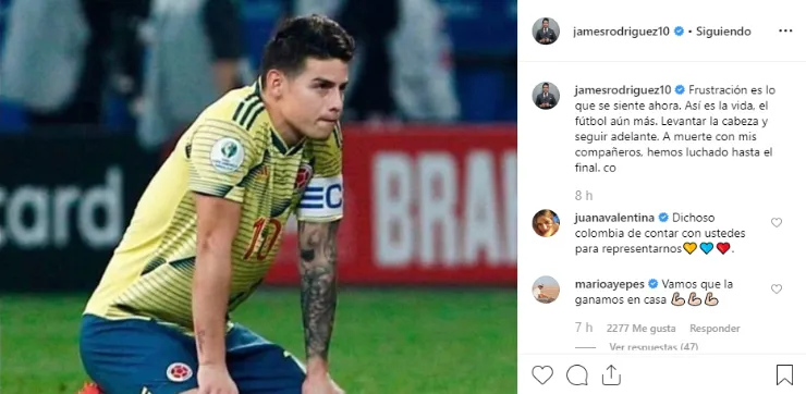 Mediante su cuenta de Instagram, horas después, James Rodríguez realizó una publicación cargada de dolor y tristeza: “Frustración es lo que se siente ahora. Así es la vida, el fútbol aún más. Levantar la cabeza y seguir adelante. A muerte con mis compañeros, hemos luchado hasta el final”.